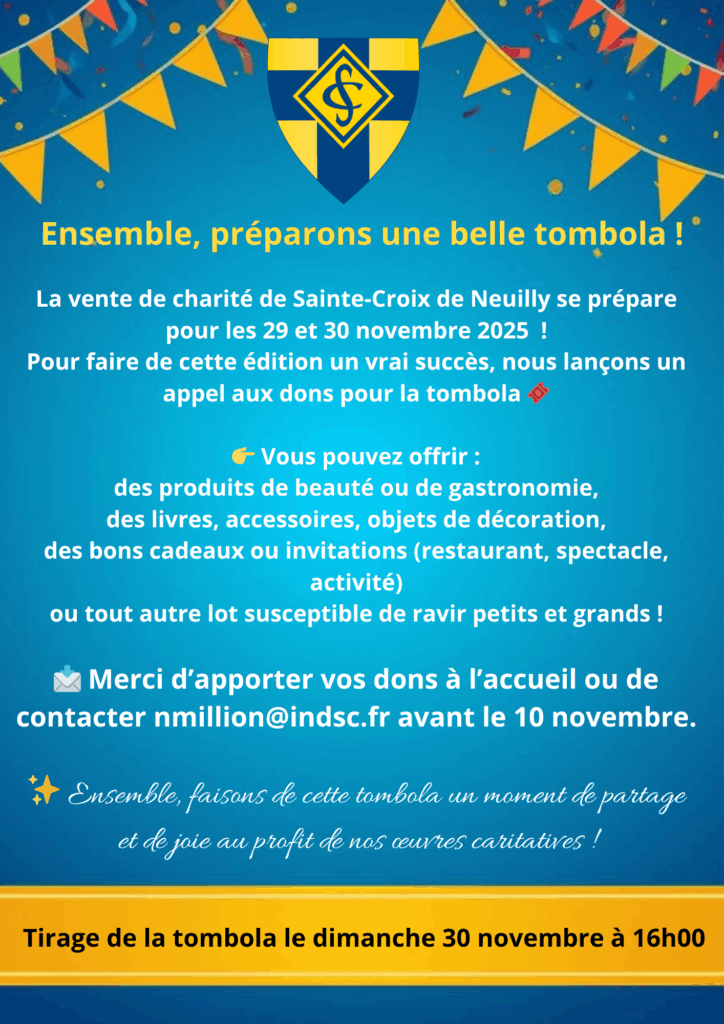#VenteDeCharité #Tombola #SainteCroixDeNeuilly #Solidarité #CommunautéSCN